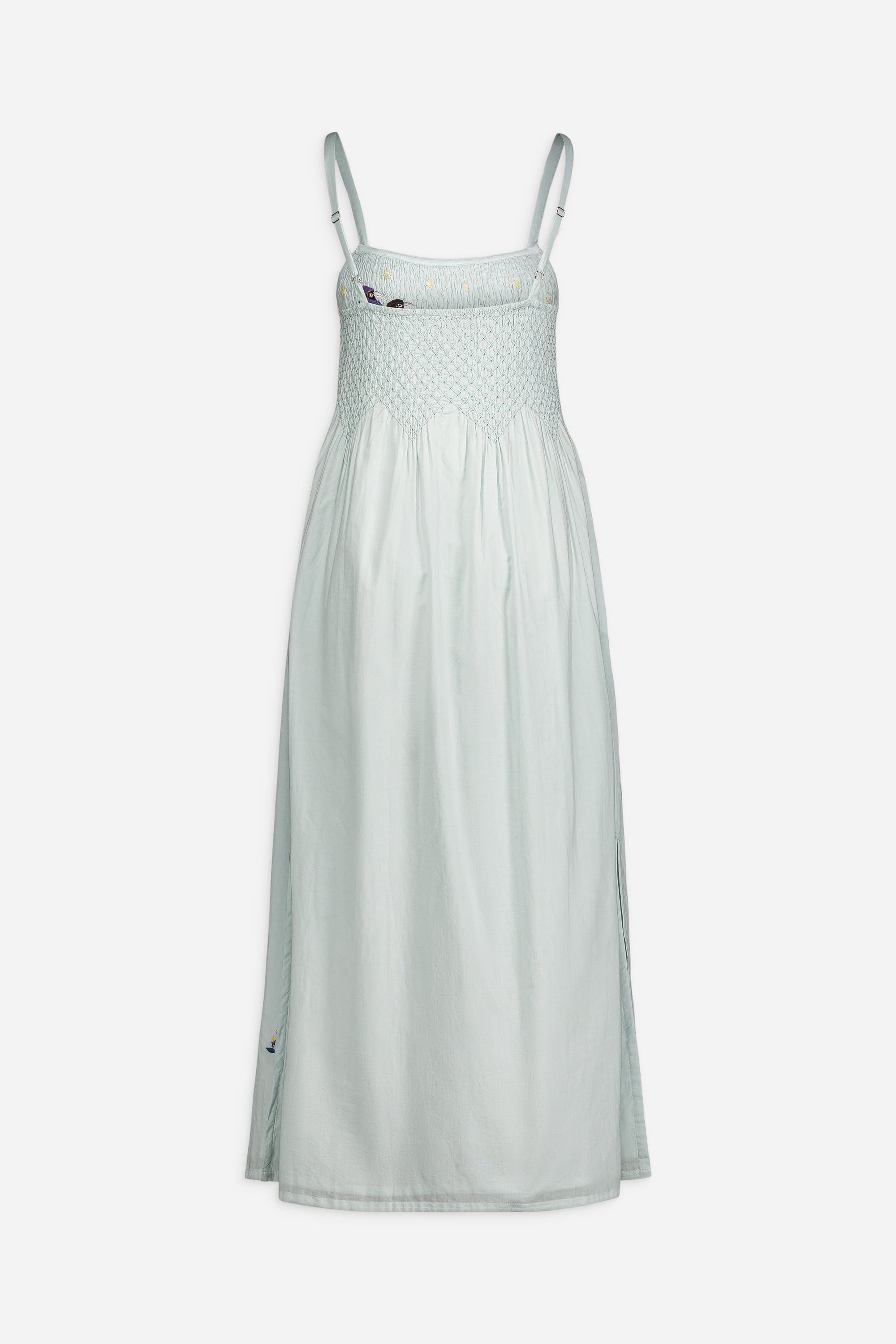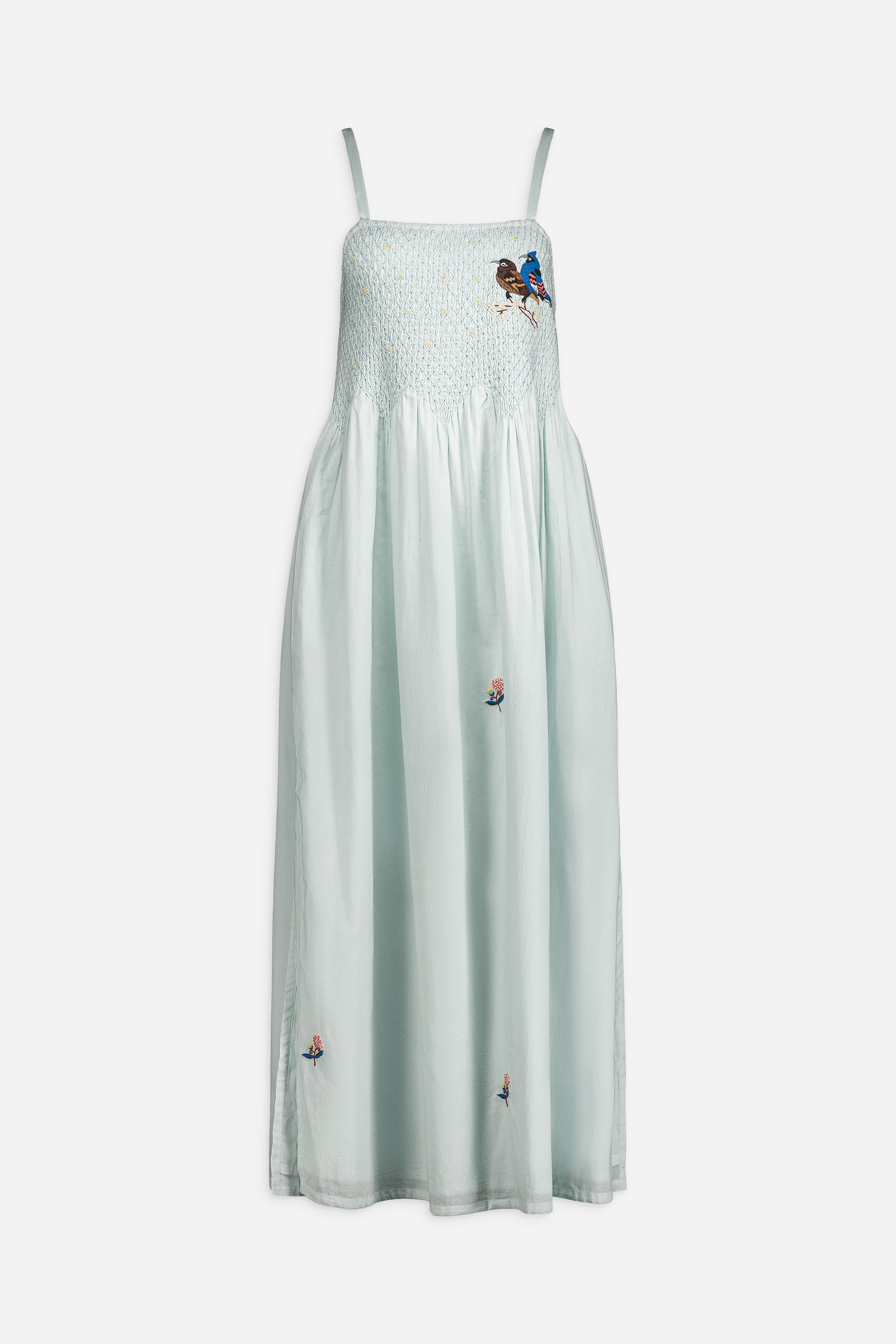 - Hand-smocked bodice with hand-embroidered birds