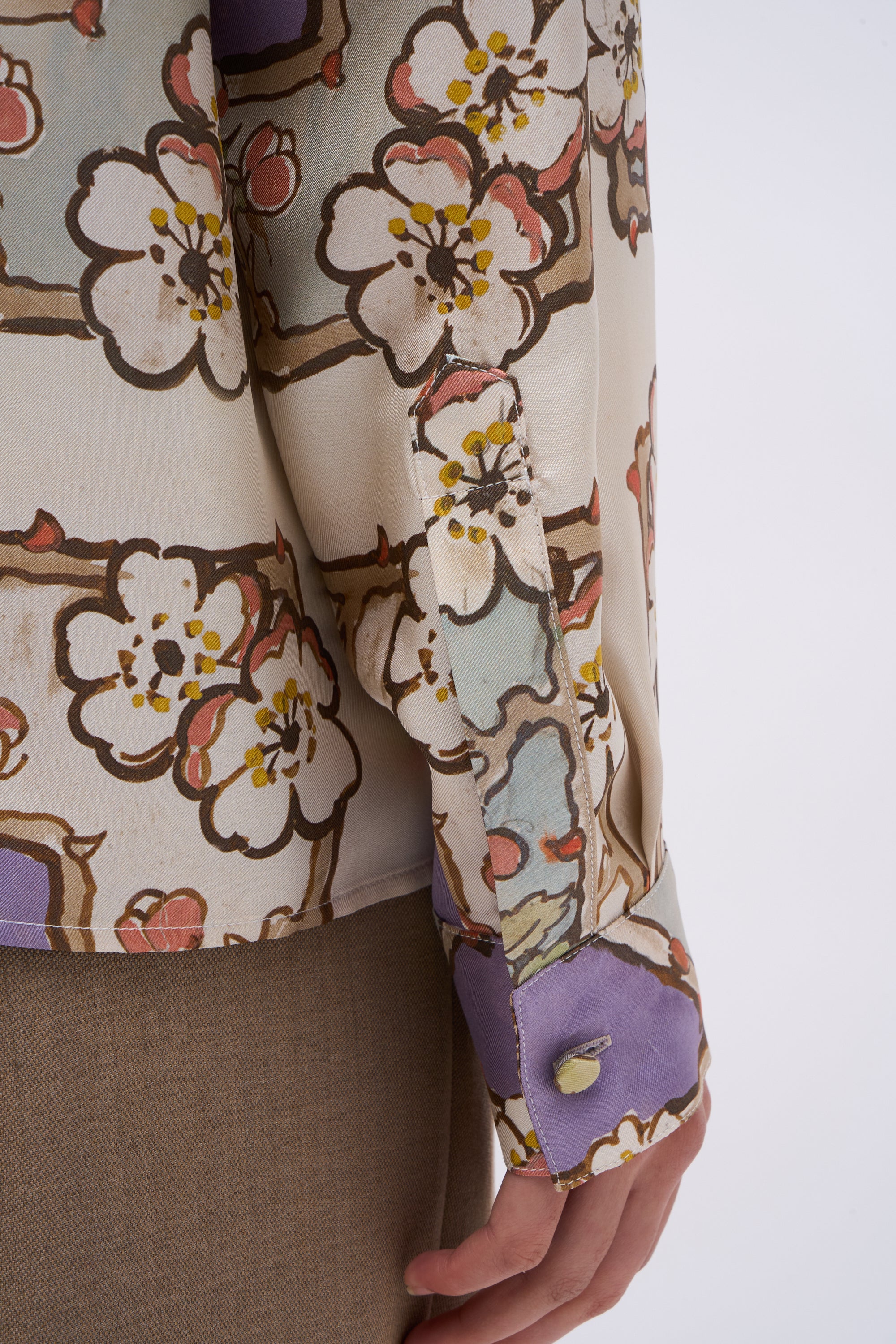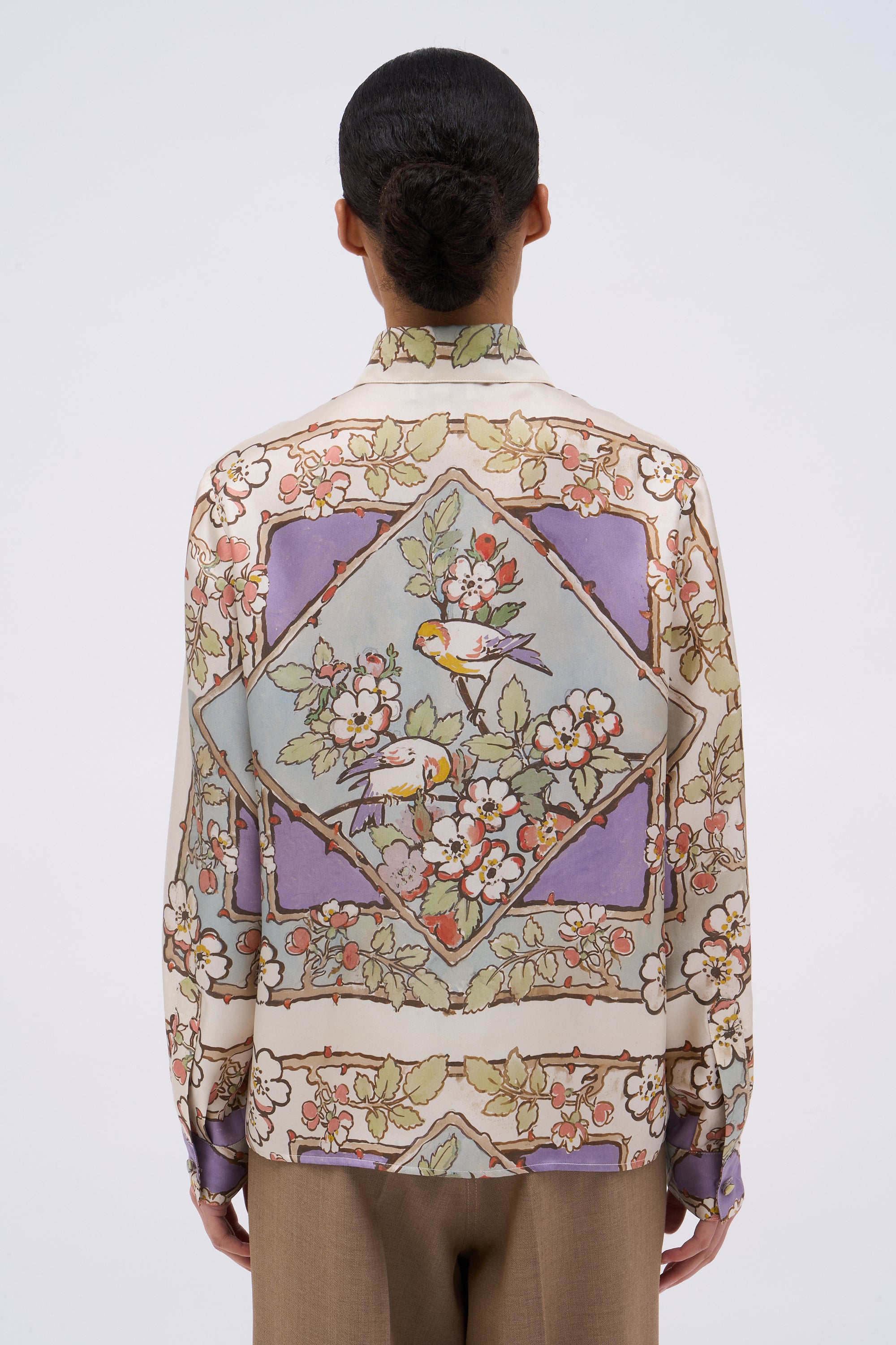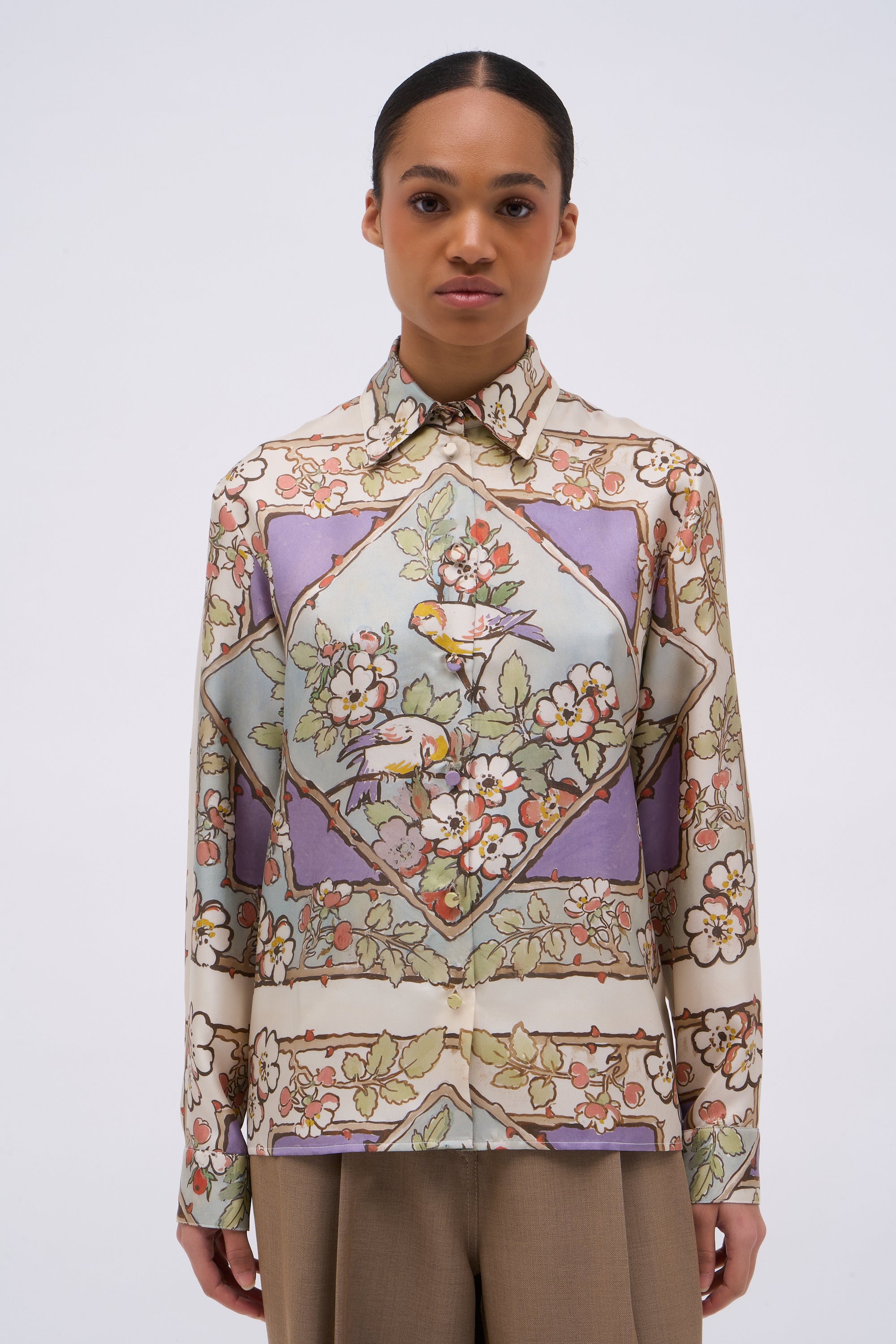Chemise en twill de soie imprimée placée, oiseaux dans le cerisier ELIXIR.