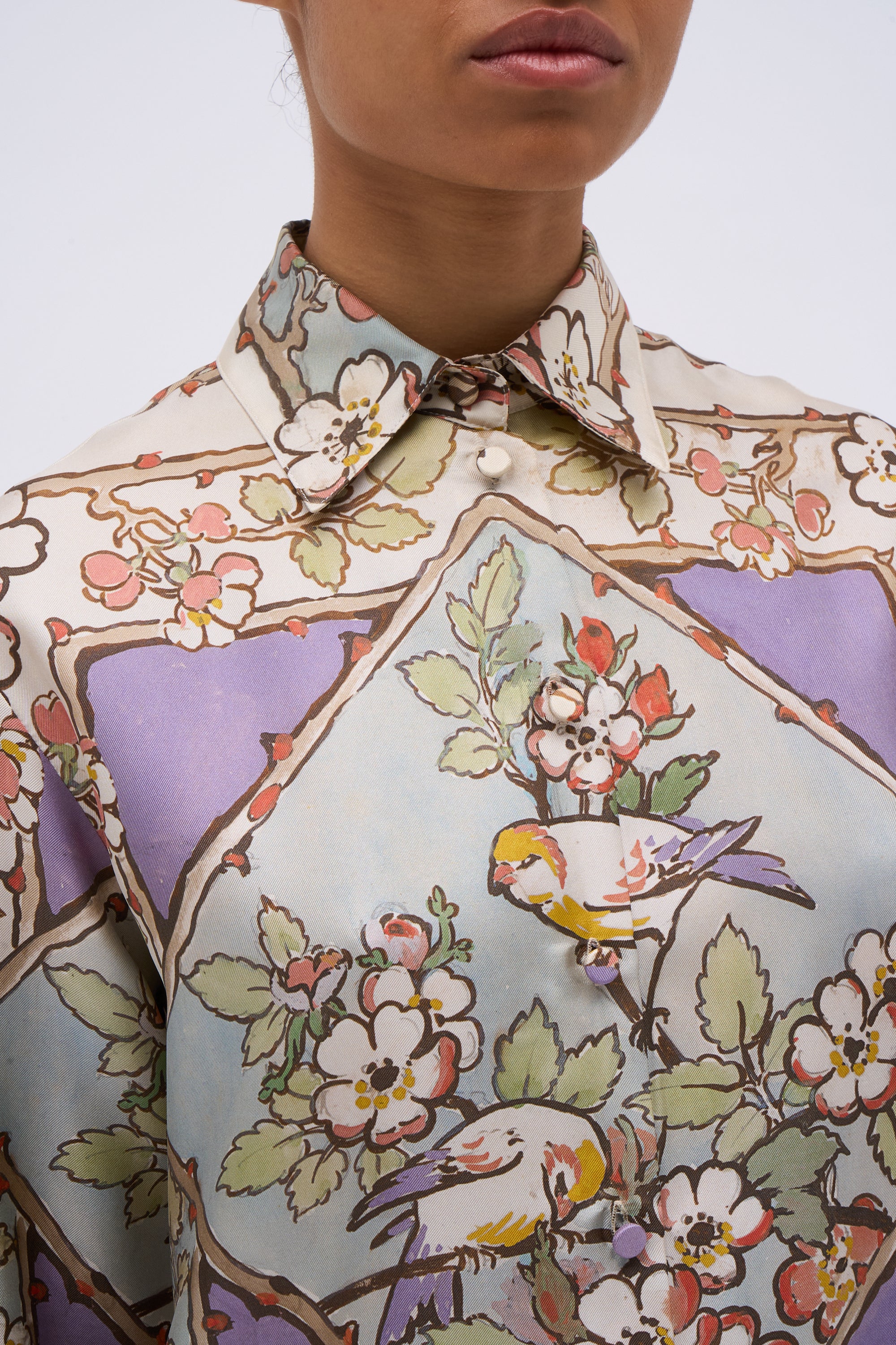 - Chemise en twill de soie imprimée placée, oiseaux dans le cerisier